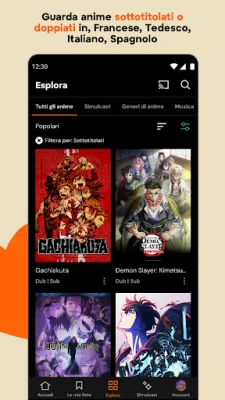 L'esperienza con Crunchyroll va oltre lo streaming tradizionale. Personalizza la tua avventura con la creazione di "Crunchylist", curando le tue collezioni di episodi preferiti e mantenendo traccia delle tue avventure animate. Non solo serie e film, ma anche un tesoro di video musicali, concerti esclusivi e performance dal vivo che celebrano la vibrante cultura J-pop e le colonne sonore che hanno definito i tuoi anime preferiti. Ricevi suggerimenti personalizzati che si adattano ai tuoi gusti, esplorando una gamma infinita di generi, dal soprannaturale alla commedia, dall'azione alle storie di vita quotidiana, con la flessibilità di scegliere tra doppiaggio e sottotitoli in diverse lingue per un'immersione completa e senza barriere.