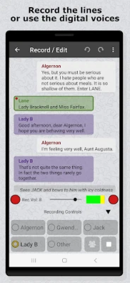 Inizia la tua prova registrando la tua voce direttamente nell'applicazione, oppure importa facilmente copioni teatrali, sceneggiature cinematografiche o semplicemente digita le tue battute. Script Rehearser è compatibile con file creati su PC o Mac e può anche processare documenti PDF contenenti testo effettivo. Una volta caricato il materiale, l'applicazione lo leggerà per te, offrendoti un supporto personalizzato grazie a opzioni configurabili. Potrai distinguere chiaramente le tue battute da quelle degli altri personaggi, aggiungere note personali o indicazioni sceniche, e decidere come visualizzare il testo per massimizzare la tua concentrazione.