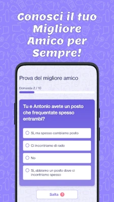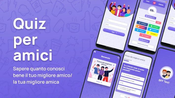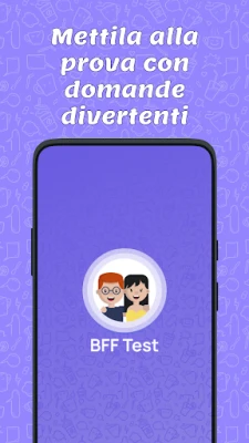 Ma BFF Test - Quiz For Friends non si limita a valutare; si propone di arricchire. Le sue domande sono create per sondare aspetti cruciali come la fiducia, la conoscenza reciproca e l'impatto che avete l'uno sulla vita dell'altro, andando ben oltre la superficie. È un'opportunità per riflettere sull'intimità e l'autenticità del vostro rapporto, scoprendo nuove sfaccettature. Inoltre, l'app ti accoglie in una vivace comunità, dove potrai condividere le tue storie, celebrare i trionfi dell'amicizia e connetterti con altri che valorizzano legami sinceri. Un'avventura che promette non solo divertimento, ma anche una crescita significativa del vostro legame.